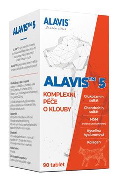 ALAVIS 5 vyživuje kloubní chrupavky, podporuje promazávací vlastnosti kloubní tekutiny, napomáhá při pohybových problémech u psů a koček. ALAVIS 5 obsahuje kombinaci látky MSM a chondroprotektivních látek – glukosamin sulfátu, chondroitin sulfátu, kyseliny hyaluronové a kolagenu.