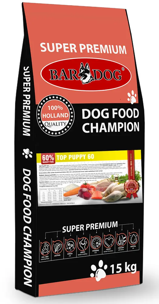 BARDOG TOP PUPPY 60 je ultra prémiové krmivo navržené pro správný růst a vývoj štěňat, zejména velkých plemen. Jeho složení je inspirováno nejnovějšími vědeckými poznatky o výživě a zajišťuje štěňatům optimální podmínky pro zdravý vývoj kostí, kloubů a svalů.