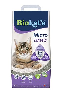 Podestýlka pro kočky od značky Biokat’s má absorbční schopnost až 300 %. Tvoří velice pevné hrudky, a proto můžete tohoto steliva používat méně, než je tomu u běžných podestýlek. Biokat’s Micro Classic z vysoce kvalitního přírodního jílu potěší hygieničností, bezprašností a účinným pohlcováním pachů. Materiál Biokat’s Micro Classic pochází z povrchových dolů a během jeho těžby nebyla narušena rovnováha flóry a fauny.