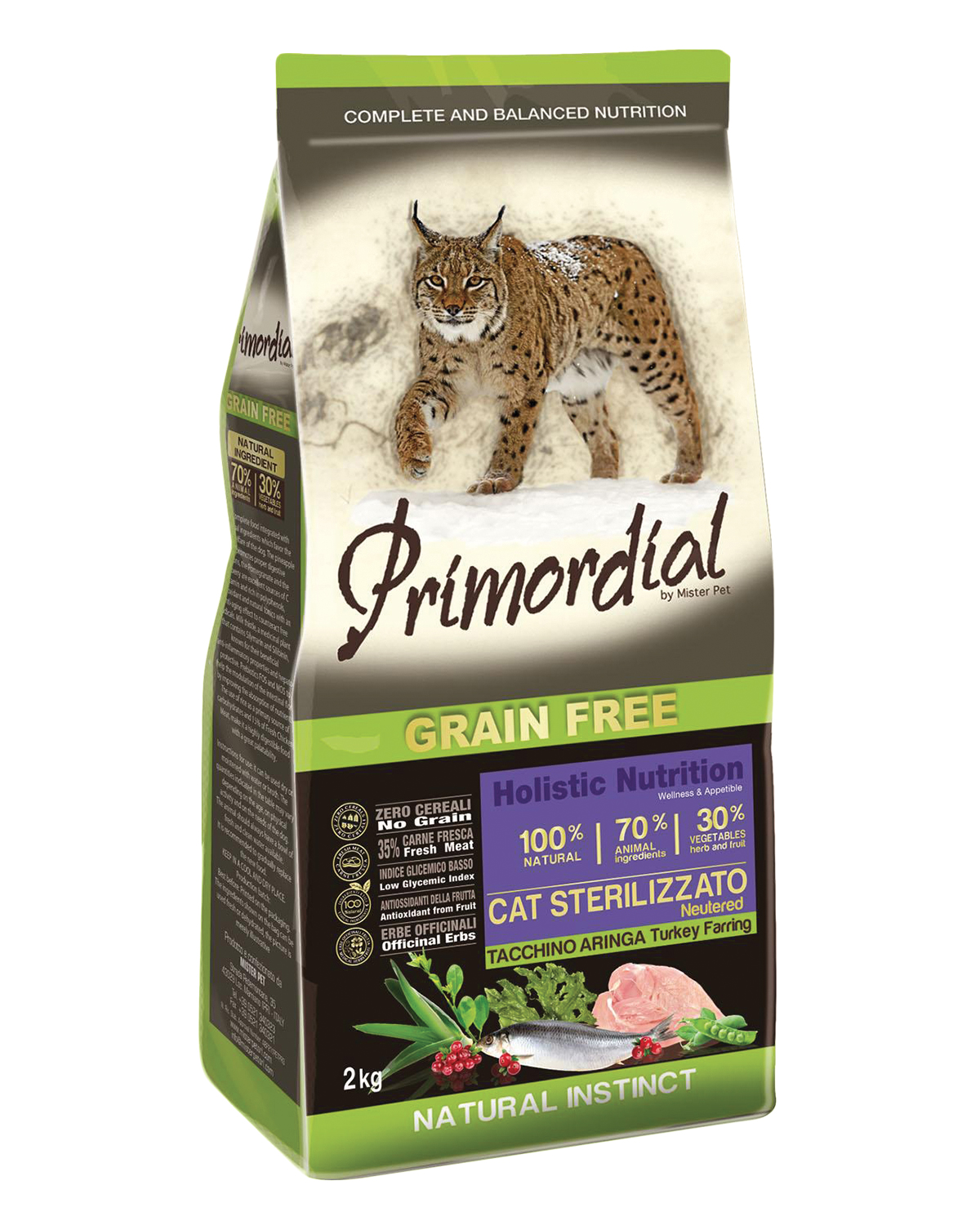 Primordial krůta a sleď pro kastrované kočky je kompletní vysoce stravitelné bezobilné krmivo bohaté na bílkoviny vysoké biologické hodnoty a obsahuje vhodnou kompozici aminokyselin. Krůtí maso, striktně z volného výběhu, je velmi chutné a obsahuje pro kočky jednoduše stravitelné bílkoviny. Sleď poskytne kompletní bílkoviny a je bohatým zdrojem omega 3 mastných kyselin, které vykonávají důležitou kosmetickou funkci pro kůži a srst a jsou velmi prospěšné pro kardiovaskulární systém (srdce a cévy). Ovoce a zelenina bohaté na vitaminy, minerály a fytonutrienty, lespedézie s blahodárnými účinky na močové cesty a brusinky s antioxidační funkcí dodávají tomuto krmivu dokonalou rovnováhu chuti a živin. Jedná se o skutečně holistický produkt, který aktivně přispívá k celkovému zdraví kočky.