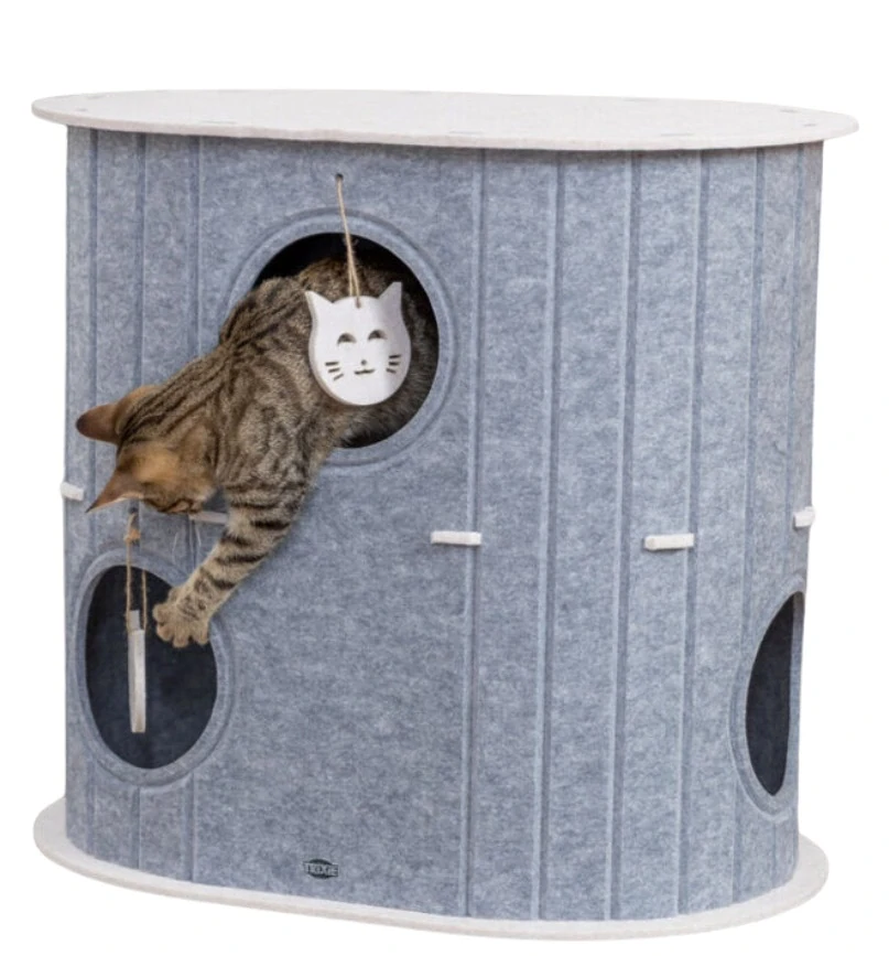 Tento kočičí domek z pevného filcu je tvarově stabilní, snadno se sestavuje a zapadne do moderního interiéru díky svému geometrickému designu.